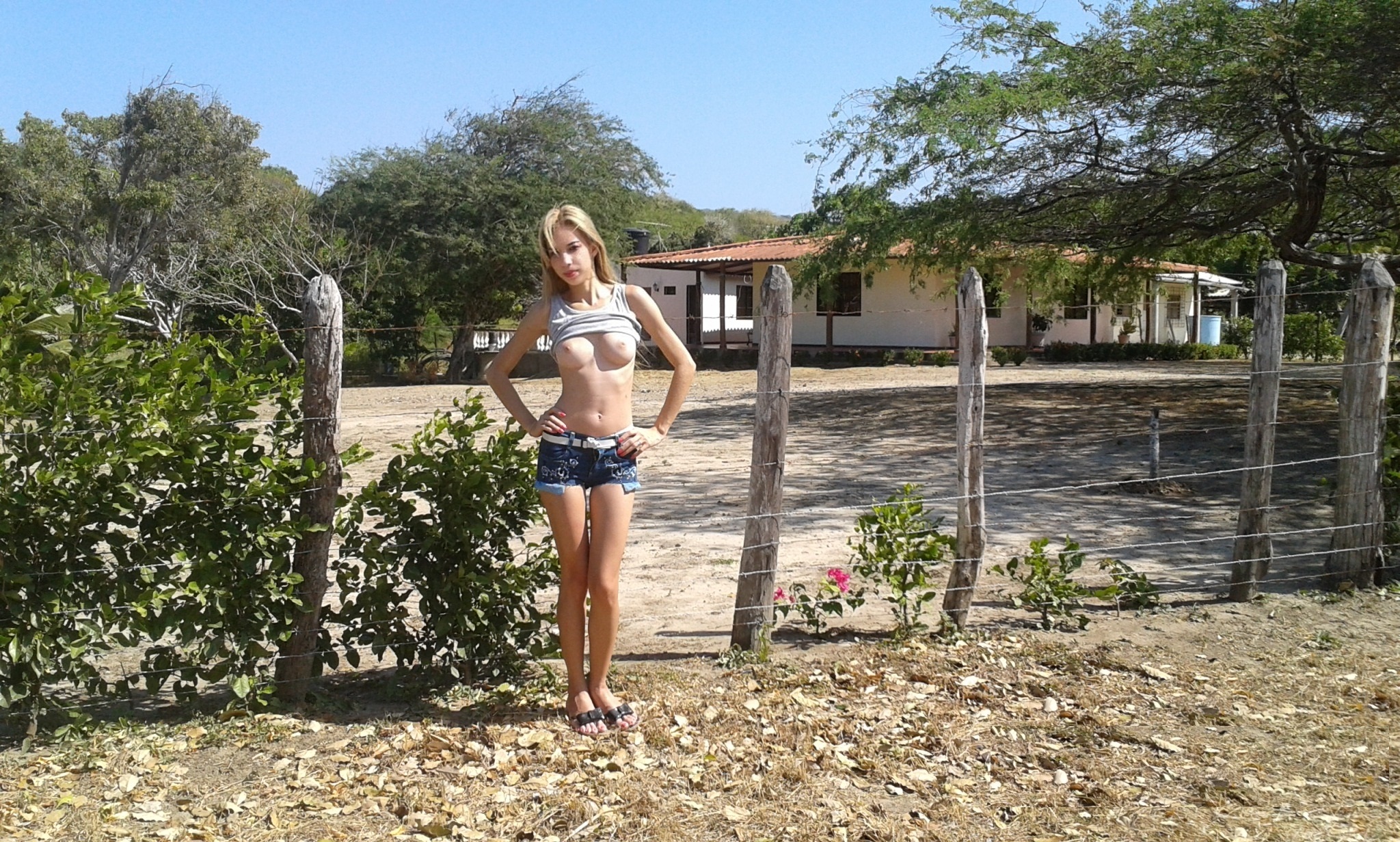 The stunning blonde is naked. The Russian beauty takes off her clothes and isn't wearing any underwear while showing off her beautiful curves; her perfect breasts and semi-shaved pussy are a stimulating sight. Exhibitionism is definitely her thing.