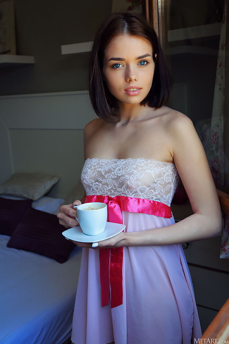 Cute brunette Keira Blue gazes out of the window as she sips her morning coffee, her mind full of erotic daydreams. She should be getting ready for work but instead she takes a little time for pleasure, pulling down the lace top of her pretty pink negligee to expose her breasts, her pale, puffy nipples so sensitive to her delicate touch. Huge blue eyes shining with arousal, she gets naked and lets her fingers wander down to the dark bush that fringes her pussy, her lips parting to reveal the luscious pink interior.