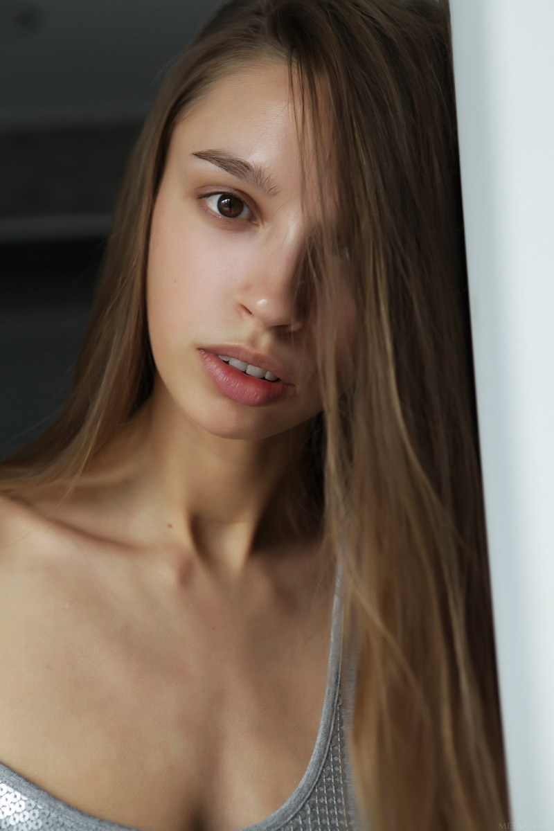 Looks can be deceptive. Take Elin - there's no denying she's a beautiful woman, but in her simple, silver dress you can be forgiven for thinking that she is a slim sylphlike creature. Indeed, her slender thighs, hips and waist would seem to prove you right... And yet, when she coyly drops the straps from her shoulders and lets it fall to her waist, her voluptuousness becomes fully apparent, for Elin has a considerable pair of beautiful breasts, large and curvaceous with upturned nipples dark and tantalizing. They come as a complete surprise!
