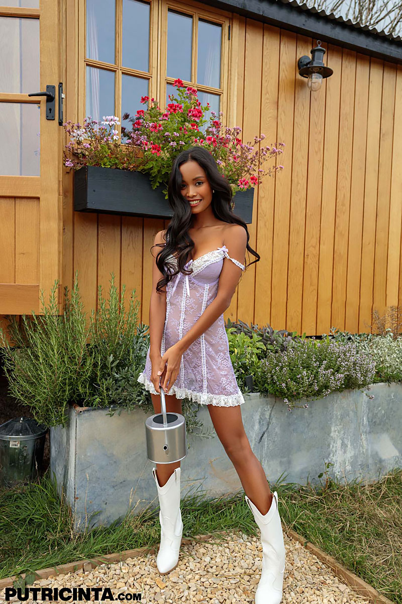 I woke up craving peace... and maybe a little mischief. So, I went out and go to this secret countryside hideaway just me, my white lace dress, and the soft morning wind. The cabin sat in the middle of golden grass, like it had been waiting for me. I slipped off my shoes, let my tan skin soak up the sun, and decided today would be my kind of slow adventure. I wandered barefoot along the path, brushing through the tall grass, pretending I was the only girl in the world. The wooden cabin smelled like lavender and sunshine, and I couldn't help but smile or maybe flirt a little with the camera. I poured myself some tea, twirled on the porch, and giggled at how the dress caught the breeze just right. Later, I played gardener for a while watering plants, teasing the camera over my shoulder, pretending I wasn't being watched (but knowing I totally was. The warm air kissed my skin, and I let it. Every step felt like a secret whispered between me and the countryside.
