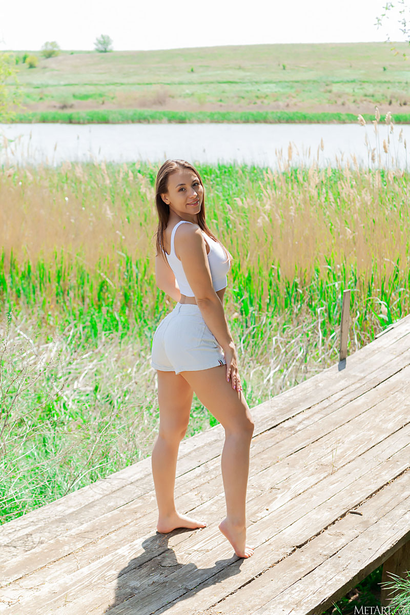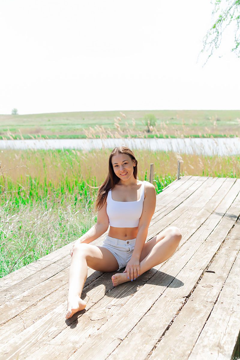 Voluptuous beauty Sumiko waits for you by the river, her sensational hourglass figure accentuated by a tight crop top and hip-hugging shorts. It's not long before the curvy brunette is naked in the sunshine, the summer breeze caressing her perfect breasts as she spreads her long legs in a wide split. Kneeling on the boardwalk, she ensures her luscious booty gets the appreciation it deserves.