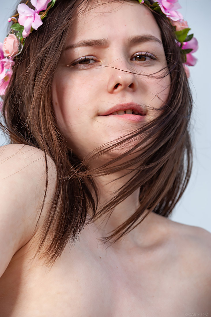 Cute brunette Matty wears a crown of flowers and a flowing white dress for her stroll on the beach. Finding a secluded spot on the rocks, the freckled sweetie removes her outfit to reveal she's not wearing underwear, her hands roaming over her gorgeous naked body. She squeezes her sexy small breasts until her puffy nipples stiffen alluringly, then spreads her shaved pussy to expose the succulent pink interior. As she pushes her fingers inside her tight slot, her naughty smile says she's ready for her first alfresco orgasm of the day.