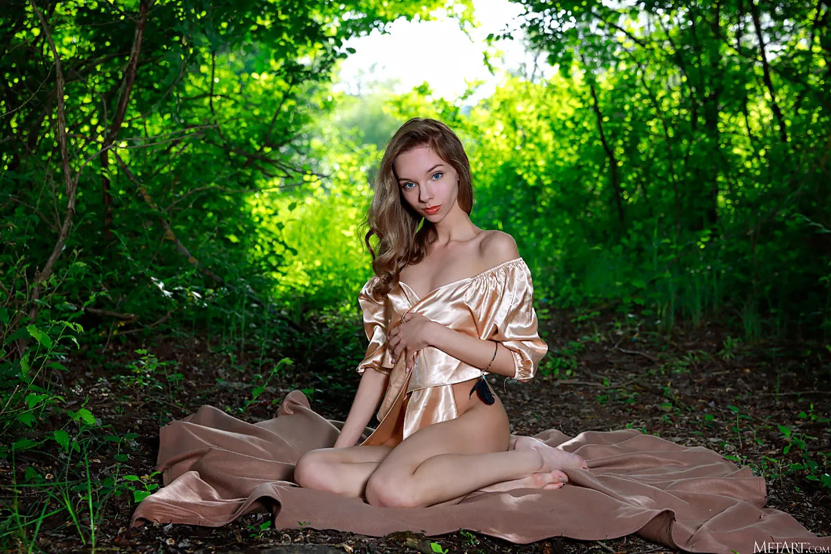 Ethereal beauty Josephine Jane waits for you in a quiet forest glade, wearing nothing but a satin wrap that falls open to expose her slender body. The petite brunette's vivid blue eyes are full of passion as she reclines on a blanket with elfin grace, every detail of her lovely small breasts and flawless bottom an intimate delight. Surrounded by trees that whisper in the gentle summer breeze, she's a vision of desire to be discovered and adored.