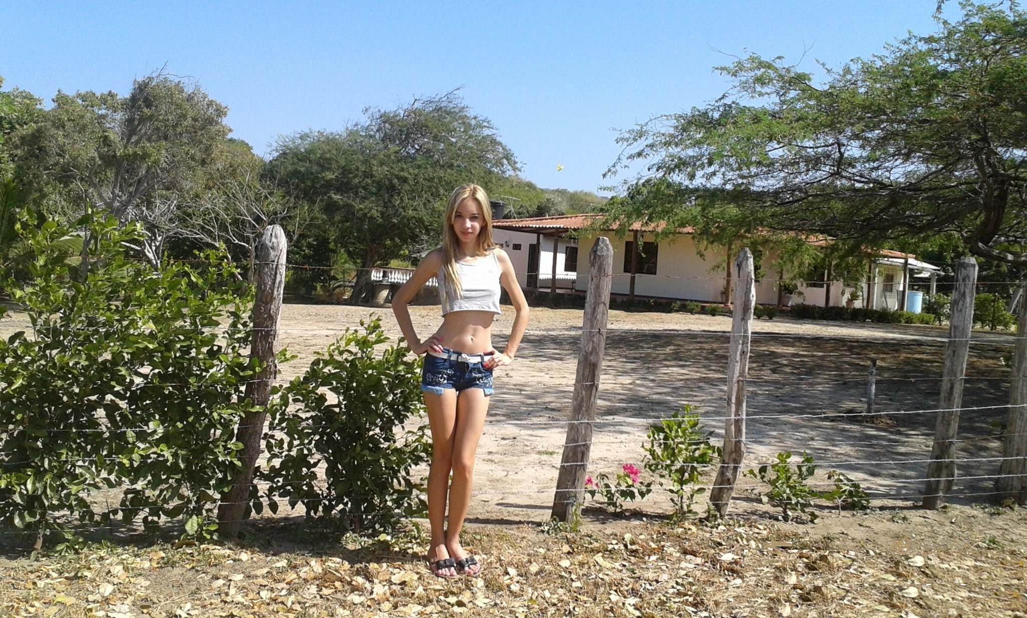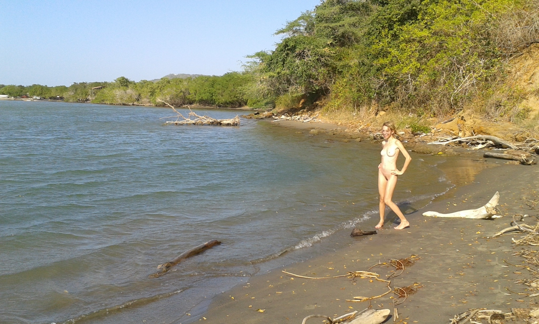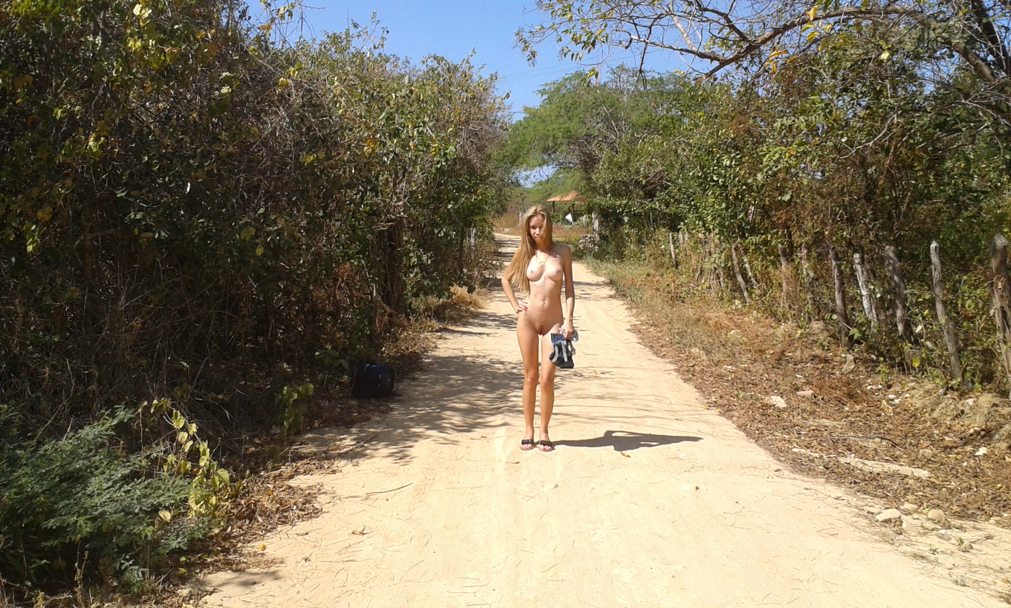 The stunning blonde is naked. The Russian beauty takes off her clothes and isn't wearing any underwear while showing off her beautiful curves; her perfect breasts and semi-shaved pussy are a stimulating sight. Exhibitionism is definitely her thing.